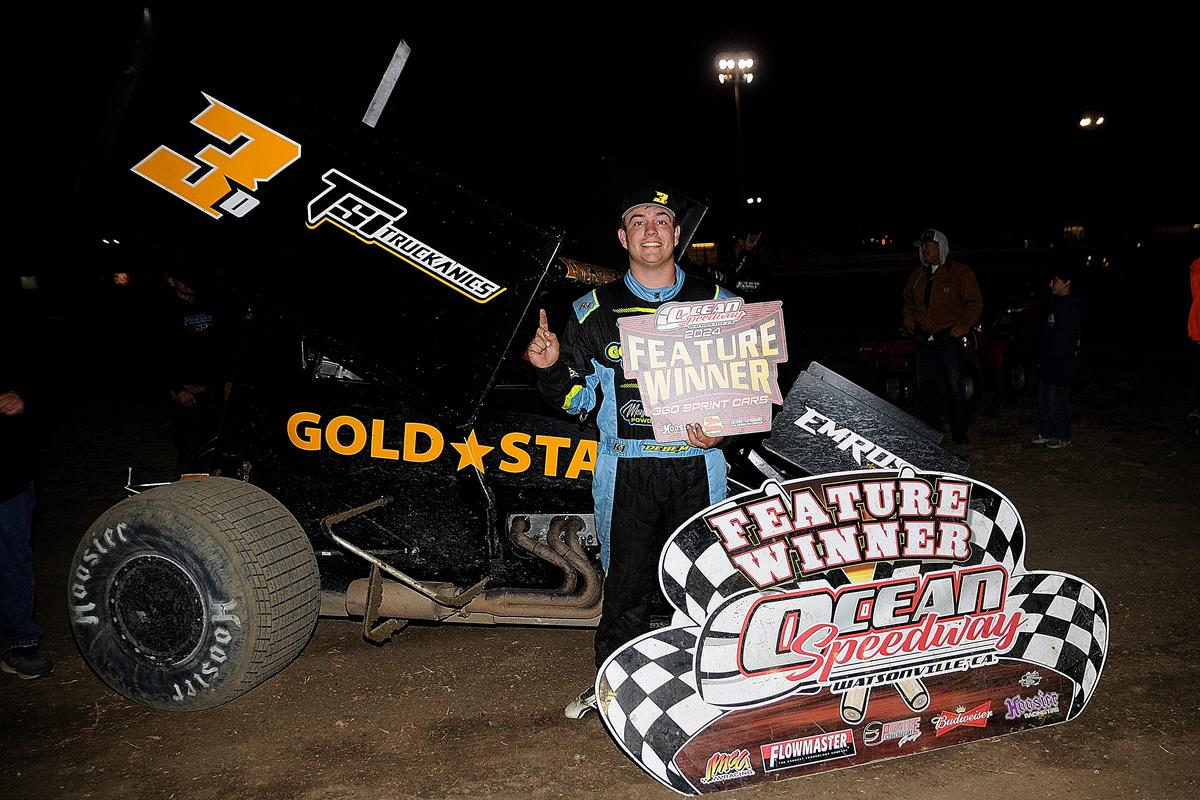 Watsonville, CA…Salinas driver Caleb Debem brought home Rookie of the Year honors at Ocean Speedway last season and on Friday night he raced to his first career Taco Bravo Sprint Car victory on the quarter-mile.